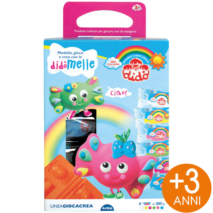 - Le DidòMelle sono tutte da modellare con Didò, la formina e gli attrezzini, decorare con gli elementi in cartoncino pre-fustellati e far giocare sullo scenario che si ritaglia dalla scatola,
